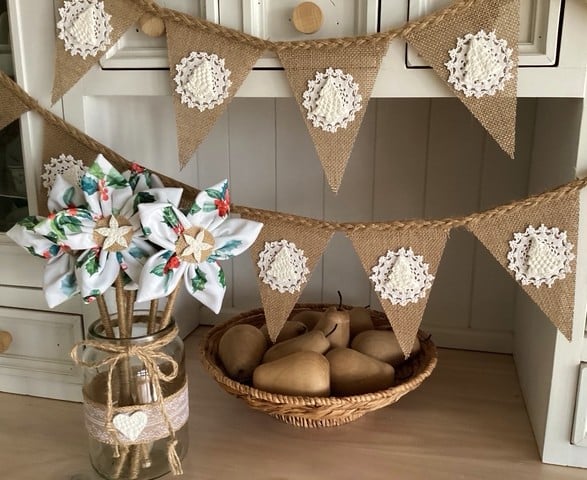 This Rustic Hessian Bunting consists of a 10-piece hessian flag strand with hand-pressed clay tags and vintage lace, all made with 4 meters of hand braided jute.