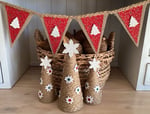 This Rustic Hessian Bunting consists of a 10-piece hessian flag strand with hand-pressed clay tags, all made with 4 meters of hand braided jute.