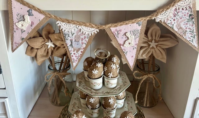 This Hessian Bunting features 10 hand-finished flags, each decorated with hand-pressed clay Easter Bunnies and soft vintage lace accents, all strung along 4 metres of hand-braided jute. Every piece is unique, giving it a special, one-of-a-kind charm.