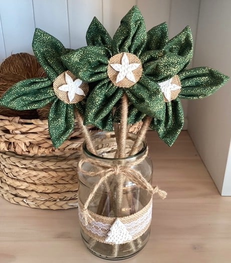 Christmas Flowers hand created from high-quality, new fabric. Each flower features a clay centre and a handwoven stem.