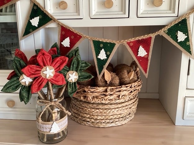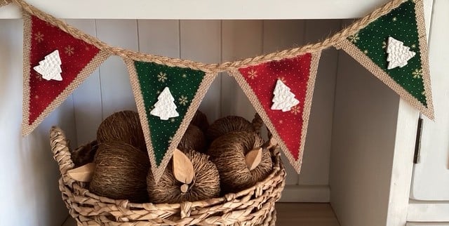 This Rustic Hessian Bunting consists of a 10-piece hessian flag strand with hand-pressed clay tags, all made with 4 meters of hand braided jute.