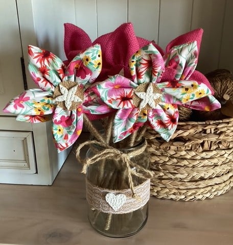 Hessian Rustic Flowers hand hand-created from high-quality, new fabric. Each flower features a clay centre and a handwoven stem.