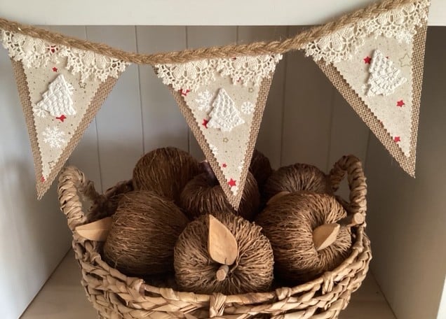 This Rustic Hessian Bunting consists of a 10-piece hessian flag strand with hand-pressed clay tags, all made with 4 meters of hand braided jute.
