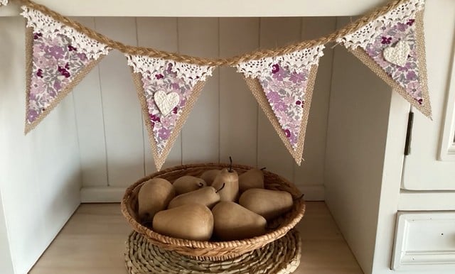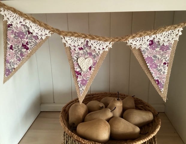 This Rustic Hessian Bunting consists of a 10-piece hessian flag strand with hand-pressed clay tags and vintage lace, all made with 4 meters of hand braided jute.