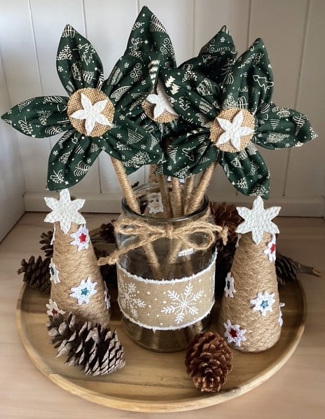 Christmas Flowers hand created from high-quality, new fabric. Each flower features a clay centre and a handwoven stem.