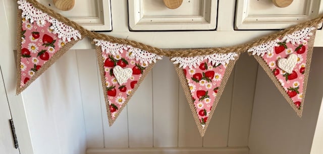 This Hessian Bunting features 10 hand-finished flags, each decorated with hand-pressed clay hearts and soft vintage lace accents, all strung along 4 metres of hand-braided jute. Every piece is unique, giving it a special, one-of-a-kind charm.