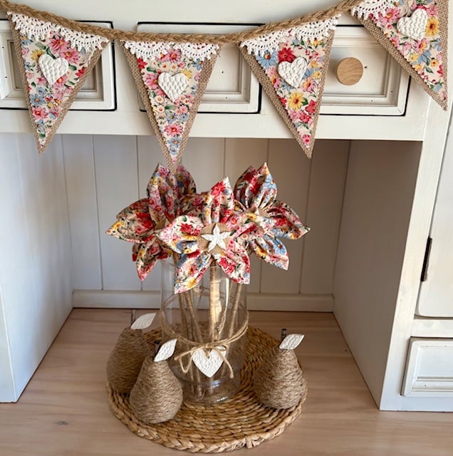 This Hessian Bunting features 10 hand-finished flags, each decorated with hand-pressed clay hearts and soft vintage lace accents, all strung along 4 metres of hand-braided jute. Every piece is unique, giving it a special, one-of-a-kind charm.