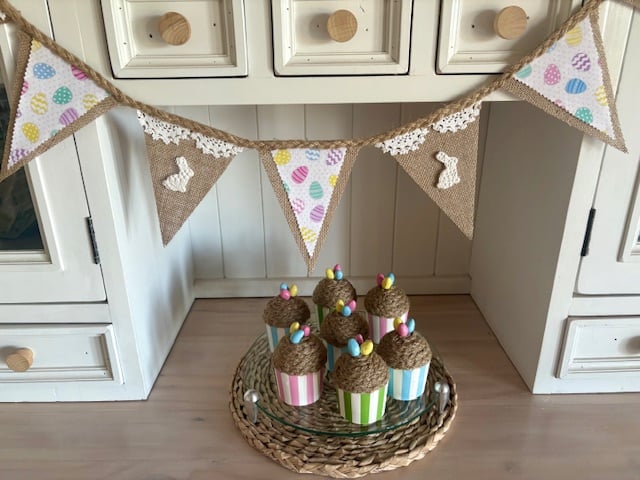 This Hessian Bunting features 10 hand-finished flags, each decorated with hand-pressed clay Easter Bunnies and soft vintage lace accents, all strung along 4 metres of hand-braided jute. Every piece is unique, giving it a special, one-of-a-kind charm.