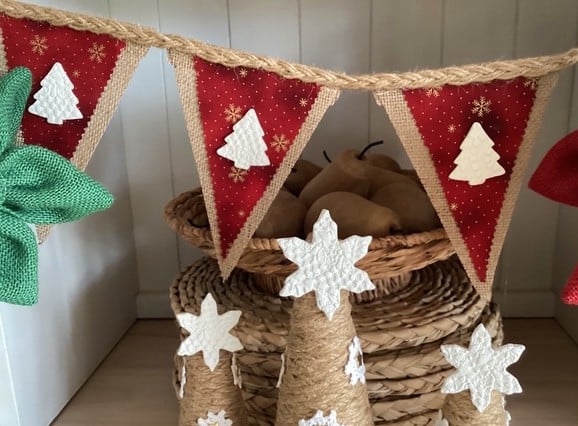 This Rustic Hessian Bunting consists of a 10-piece hessian flag strand with hand-pressed clay tags, all made with 4 meters of hand braided jute.