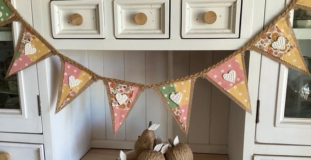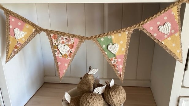 This Hessian Bunting features 10 hand-finished flags, each decorated with hand-pressed clay hearts, all strung along 4 metres of hand-braided jute. Every piece is unique, giving it a special, one-of-a-kind charm.