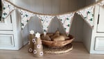 This Rustic Hessian Bunting consists of a 10-piece hessian flag strand with hand-pressed clay tags and vintage lace, all made with 4 meters of hand braided jute.