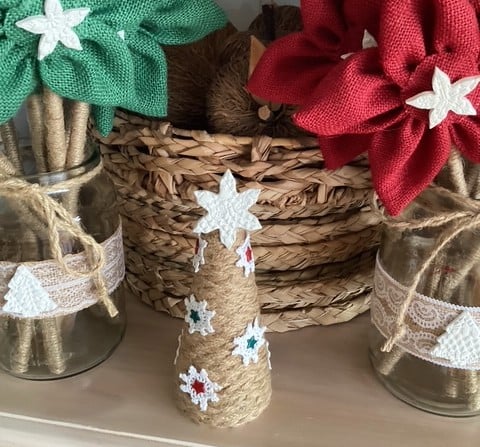 Introducing my charming Rustic Christmas Tree, meticulously crafted from beautifully hand-plaited jute braid. Adorned with delicate vintage doilies that whisper of nostalgia and seasoned with gleaming metal stars, this tree captures the spirit of a cozy holiday season. Topping it all off is a stunning hand-pressed clay star, adding a unique, artisanal touch. Standing elegantly at 18 cm tall and measuring 7 cm in diameter, this enchanting piece will bring a touch of rustic charm to your festive décor.