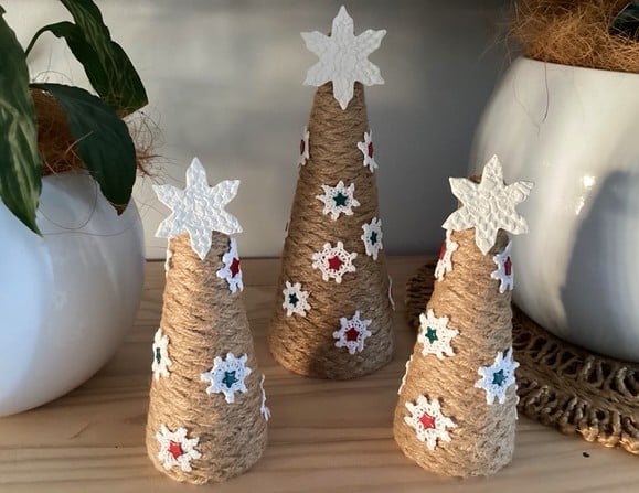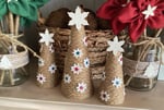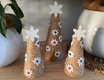 Introducing my charming Rustic Christmas Tree, meticulously crafted from beautifully hand-plaited jute braid. Adorned with delicate vintage doilies that whisper of nostalgia and seasoned with gleaming metal stars, this tree captures the spirit of a cozy holiday season. Topping it all off is a stunning hand-pressed clay star, adding a unique, artisanal touch. Standing elegantly at 25 cm tall and measuring 9 cm in diameter, this enchanting piece will bring a touch of rustic charm to your festive décor.